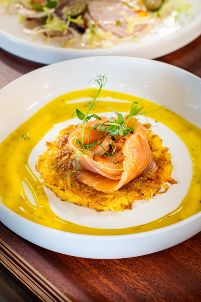 - Hummer-Lachs-Carpaccio – delikat, serviert mit Basilikumdressing und Hummercreme.