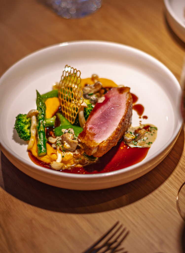 - Rosa gebratenes Entenbrustfilet – serviert mit Portwein-Rosmarin-Sauce, Brokkoli und Karotten-Ingwer-Püree.