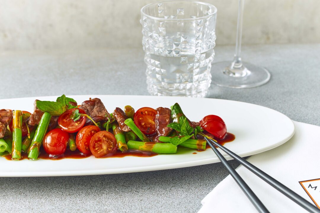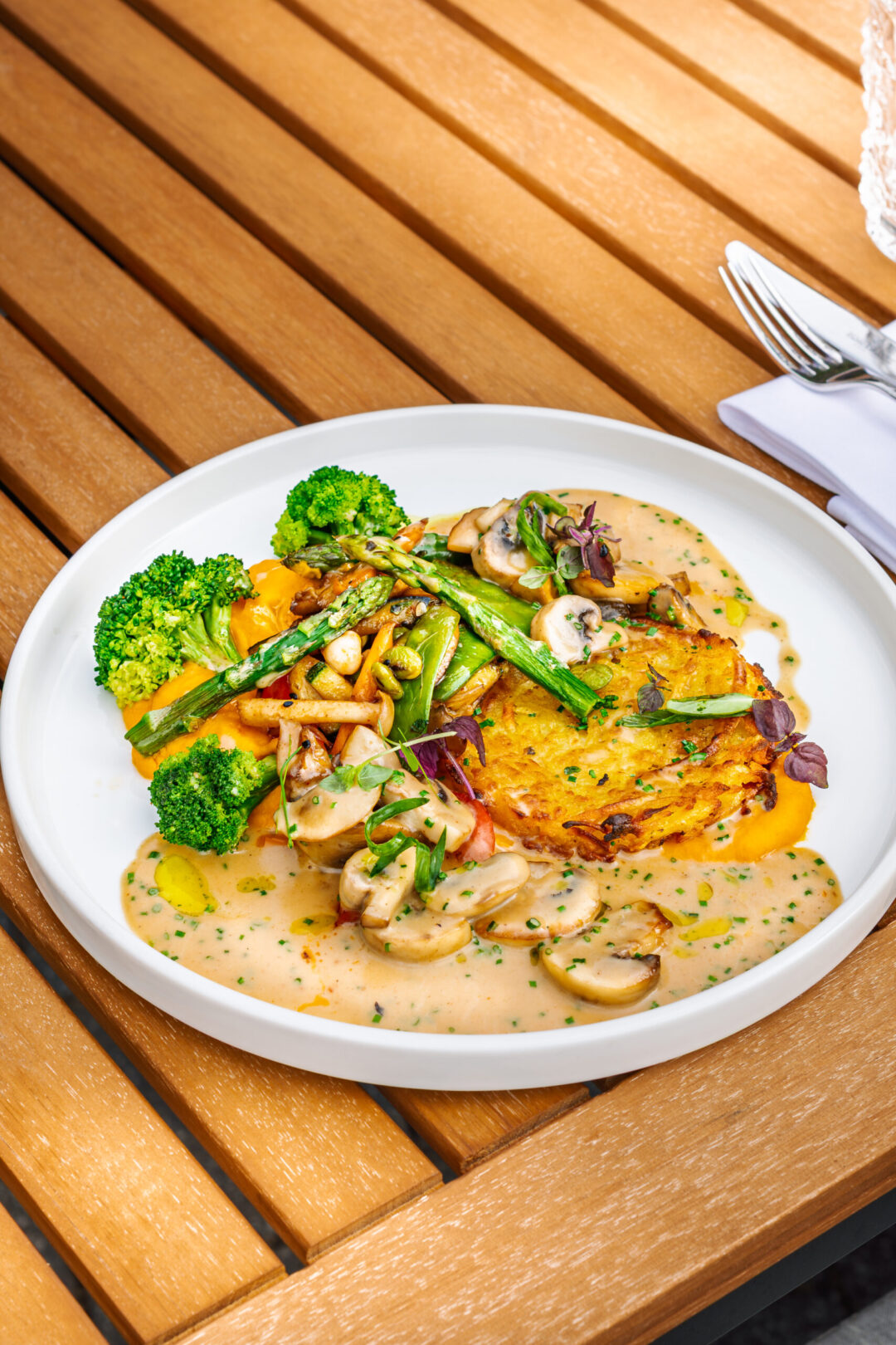 - Würziges WOK-Gemüse – Karotten-Inwer-Püree, Brokkoli und grüner Spargel mit knusprigen Kartoffel-Rösti in Champignon-Sauce.