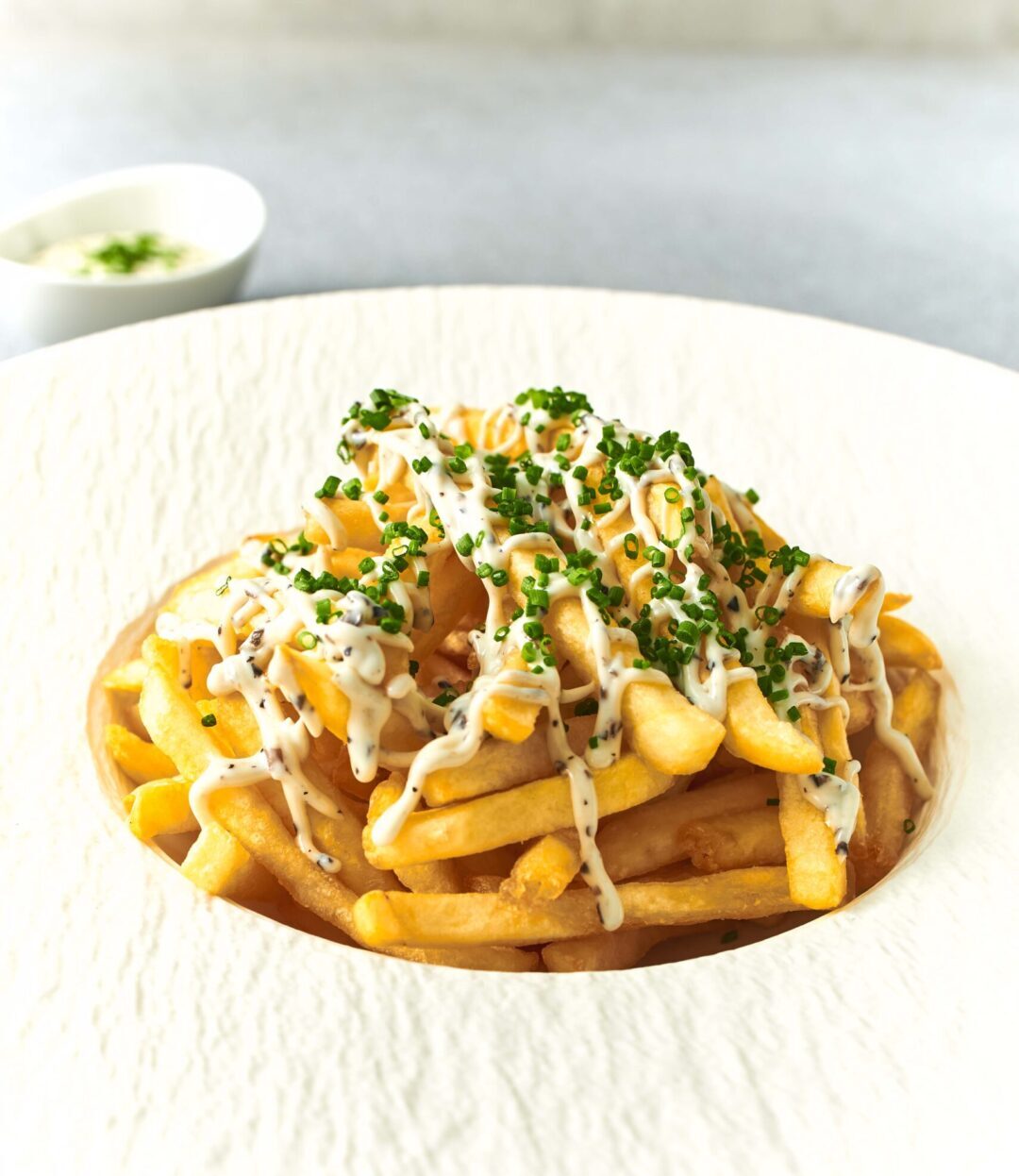 - Trüffel-Pommes – knusprig, mit Parmesan, Schnittlauchröllchen und Trüffel-Mayo.