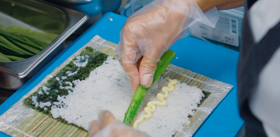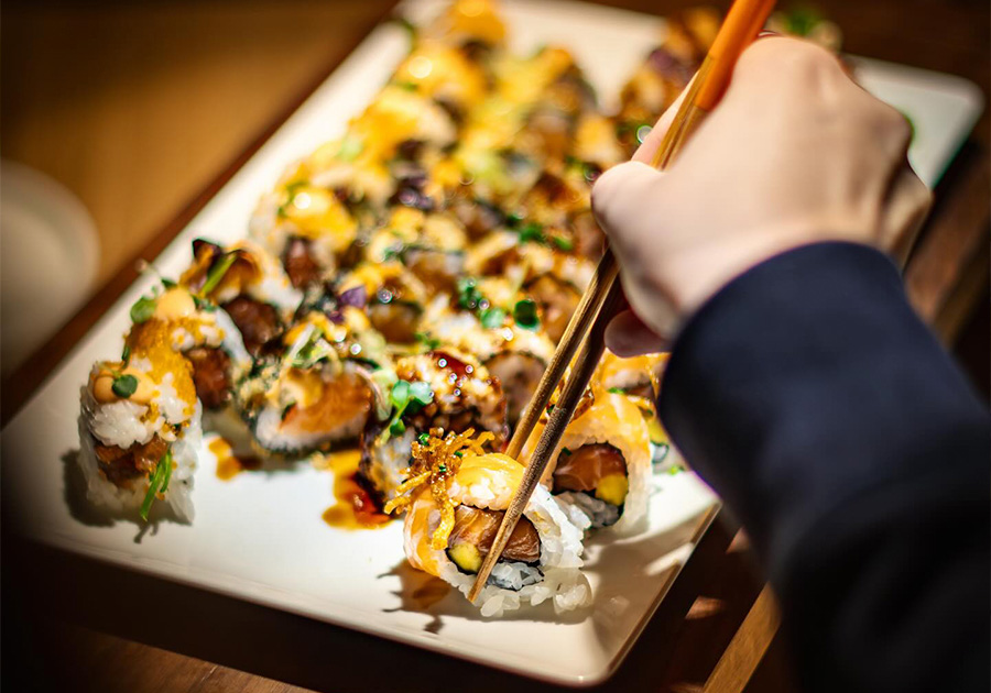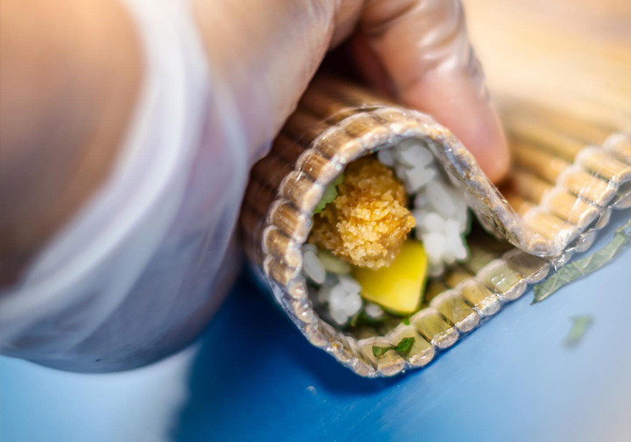 Für das Rollen wird das Nori-Blatt auf die Bambusmatte gelegt, der Reis gleichmäßig verteilt und die Füllung präzise platziert. Der Druck beim Rollen ist entscheidend. Wenn die Rolle zu locker ist, fällt sie auseinander, und wenn sie zu fest gerollt wird, verliert sie ihre zarte Textur. Ein scharfes, leicht befeuchtetes Messer sorgt beim Schneiden für glatte Kanten und gleichmäßige Stücke, damit auch die Optik überzeugt – schließlich isst das Auge mit.
